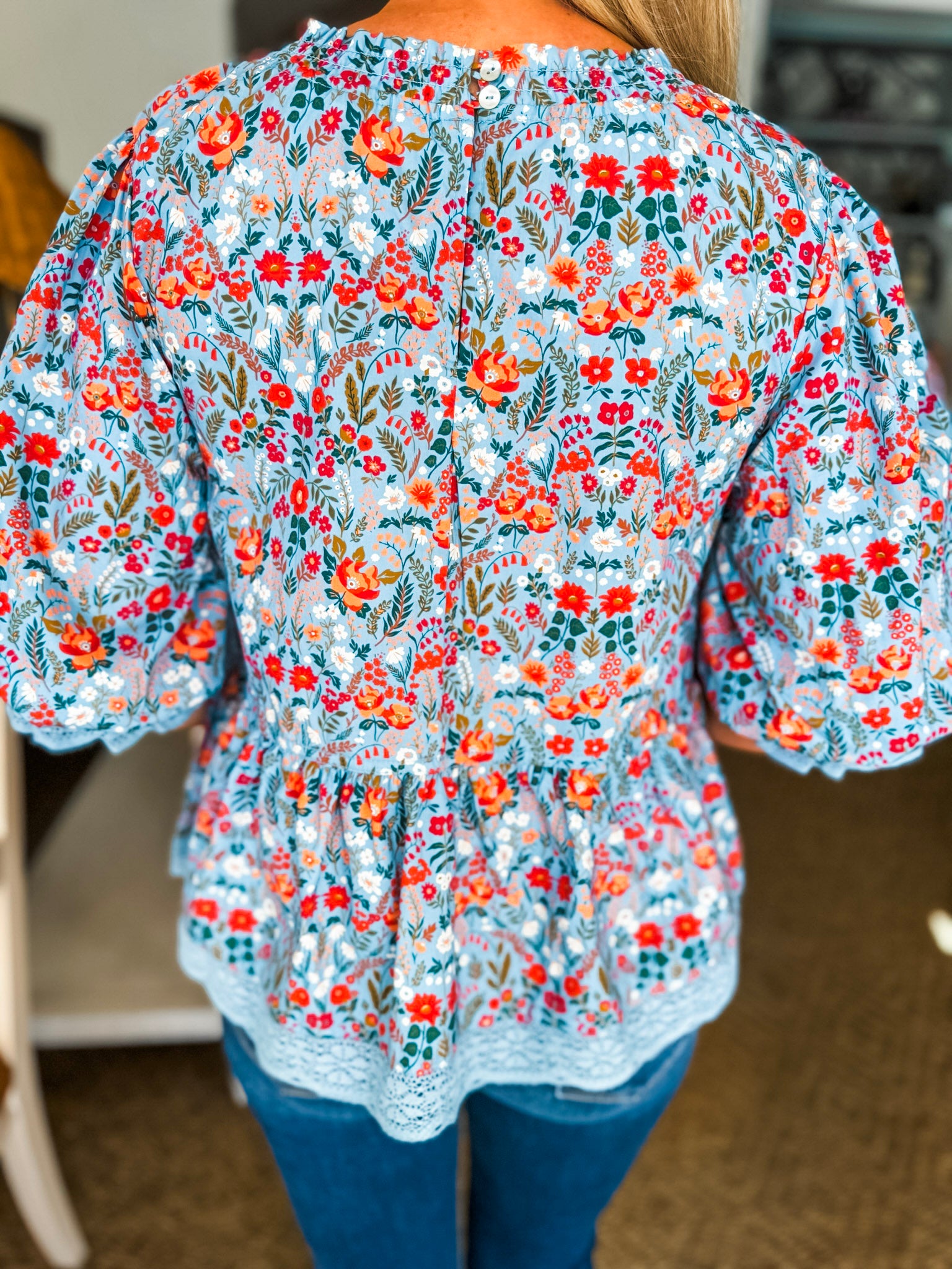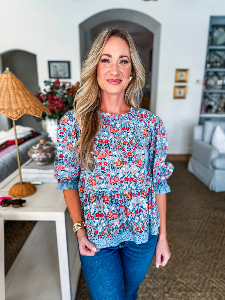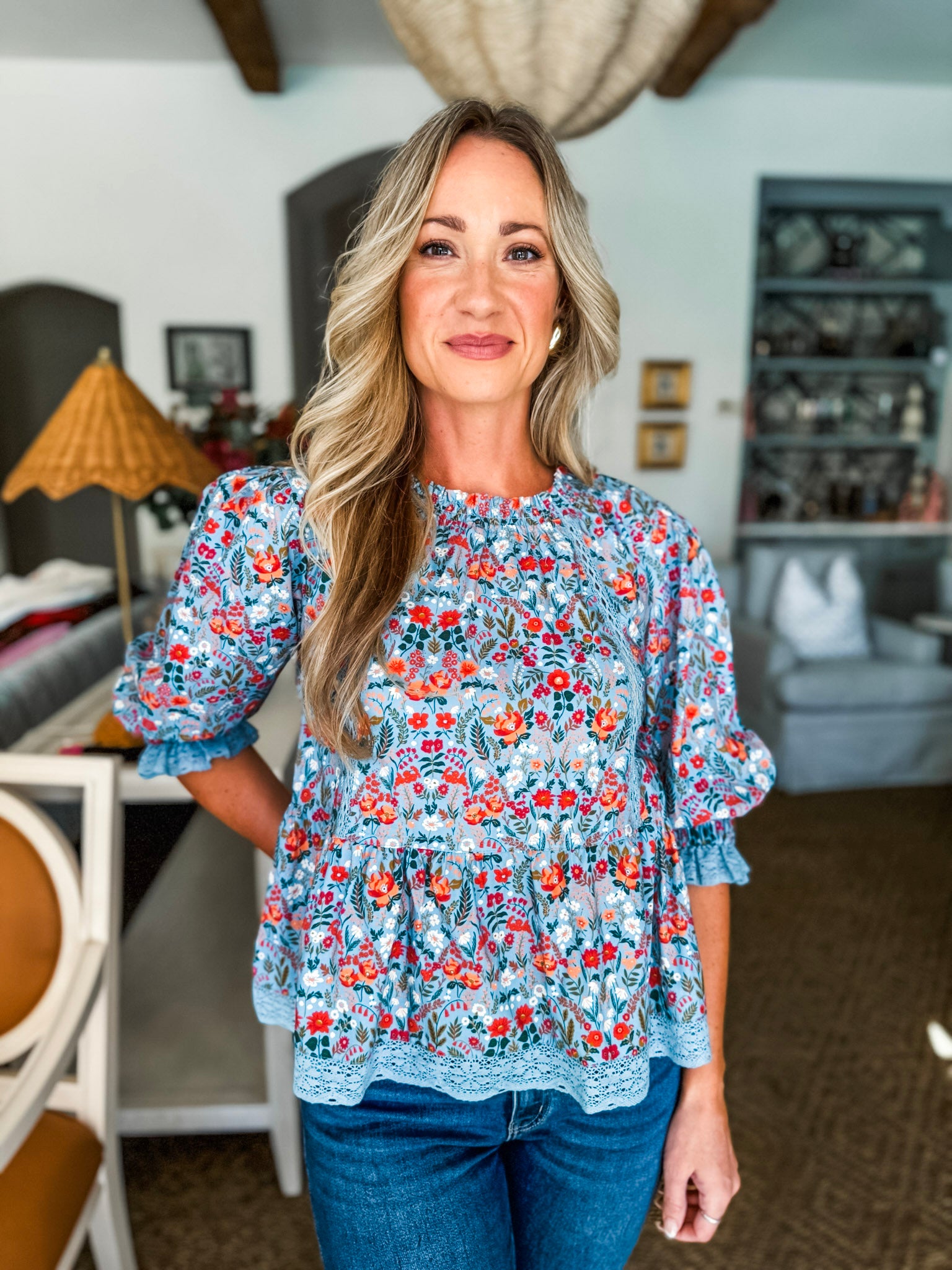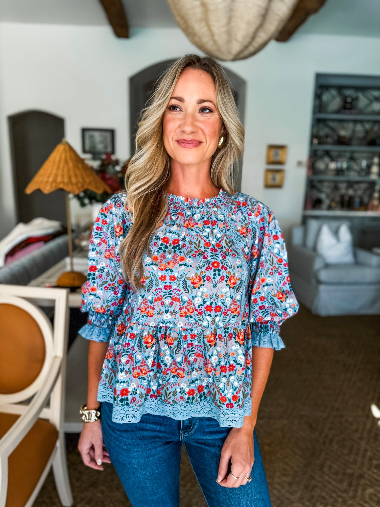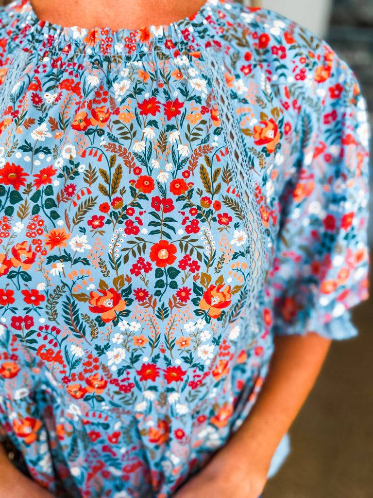 The Floral Blue Bloom Top in dusty blue brings feminine charm to your everyday look! With its soft woven fabric, smocked neckline, and dainty lace-trimmed sleeves, this piece feels effortlessly pretty. Perfect for brunch dates, weekend strolls, or casual Fridays at work. Style it with jeans or flowy trousers and let those floral vibes bloom!