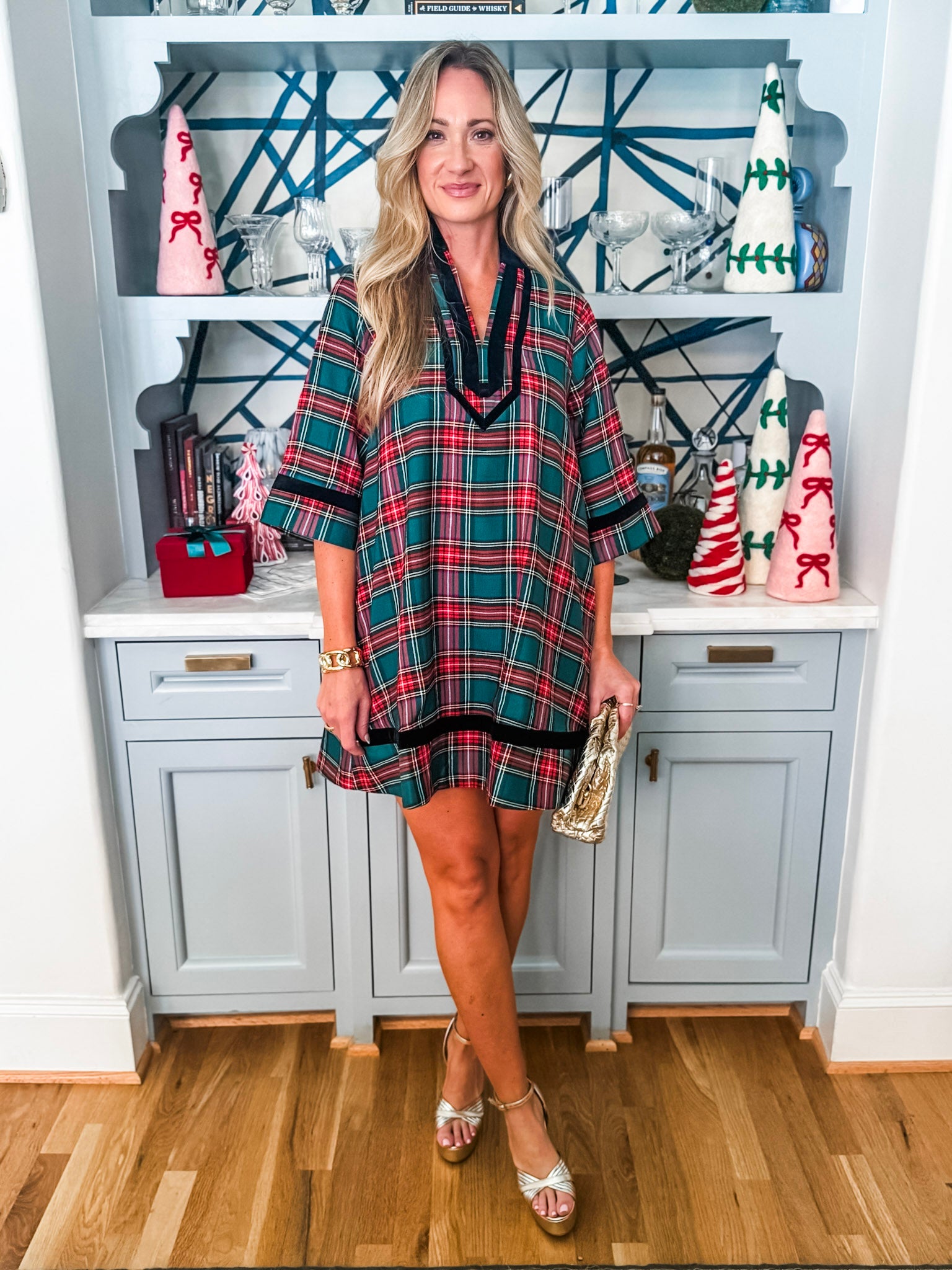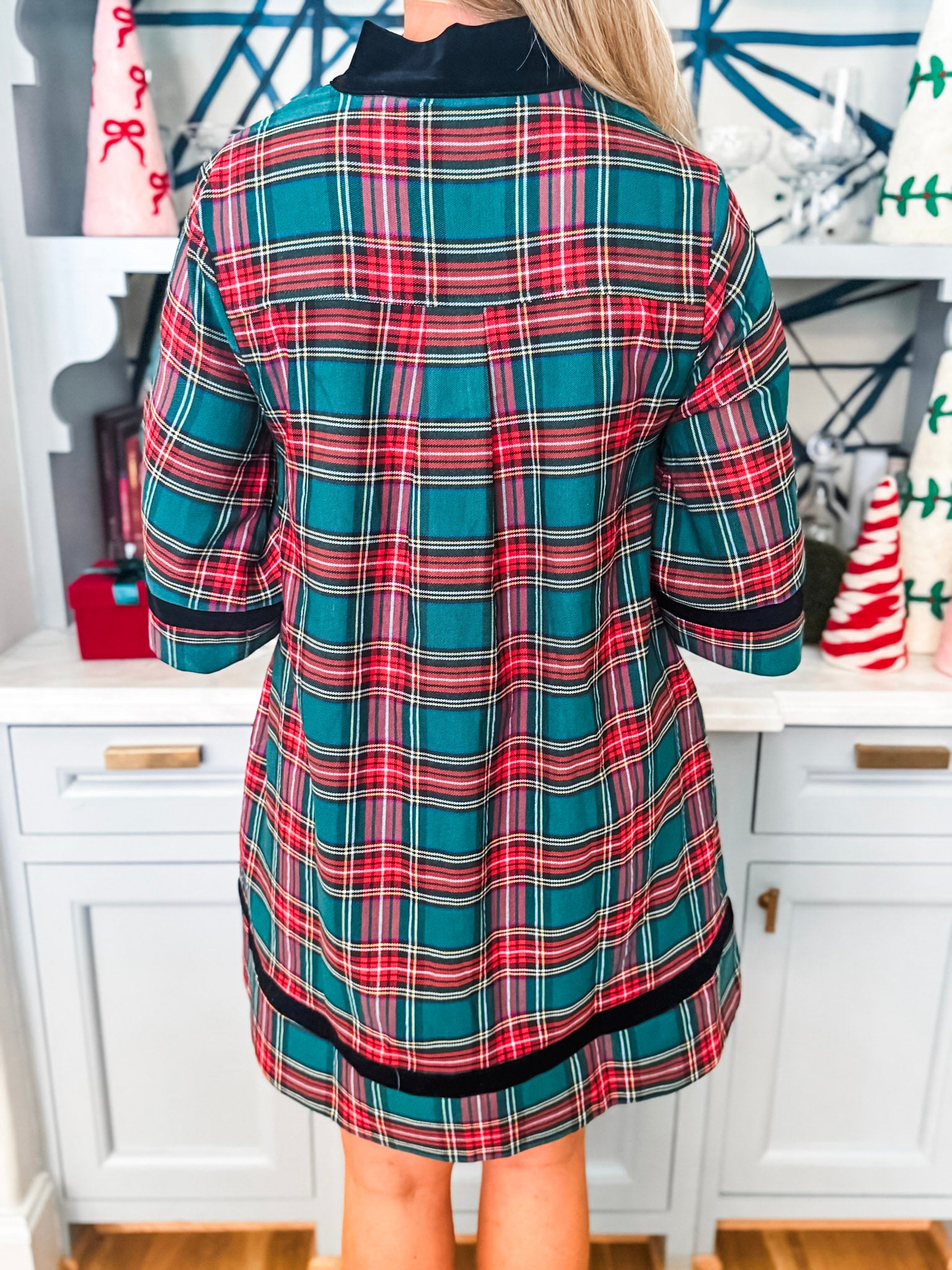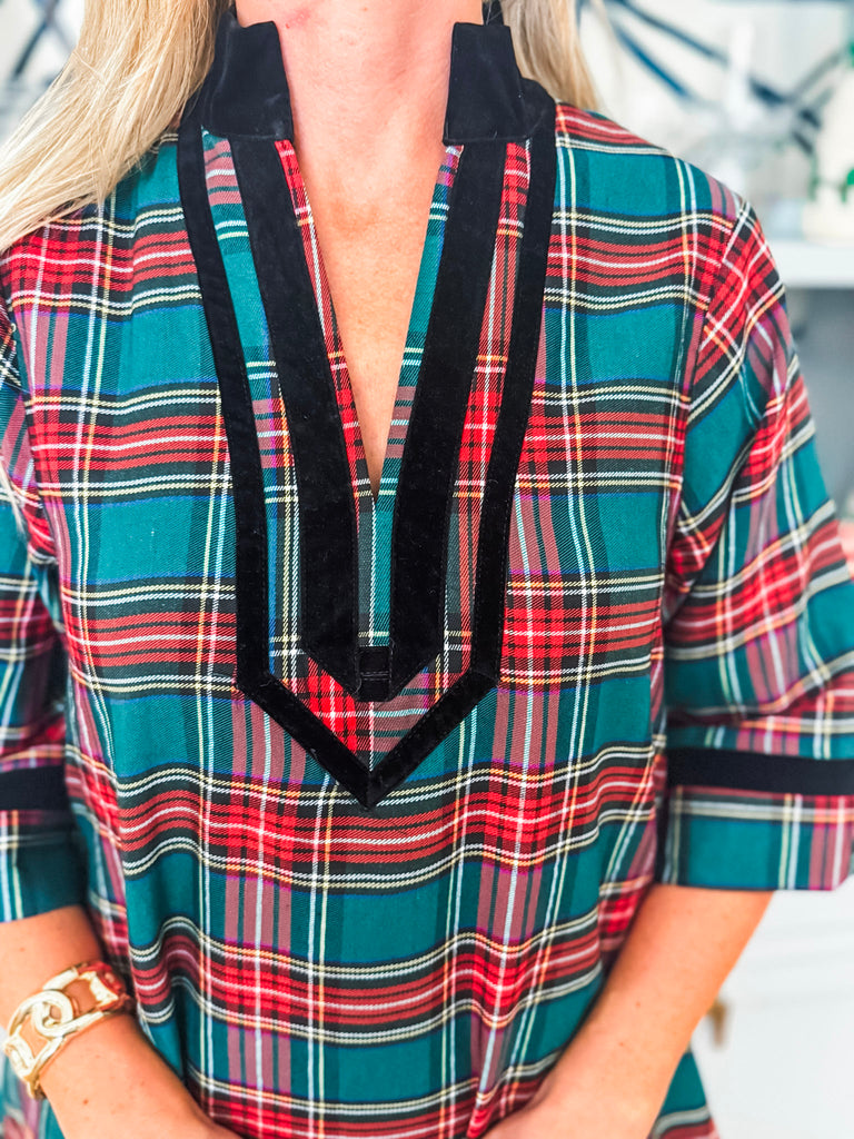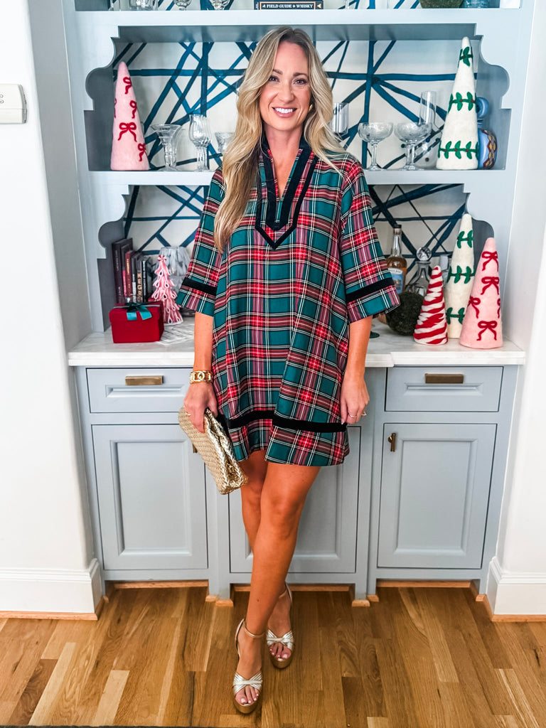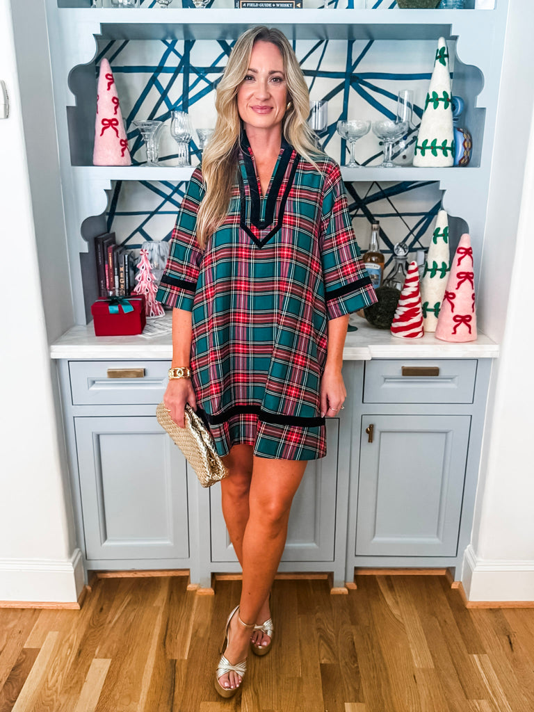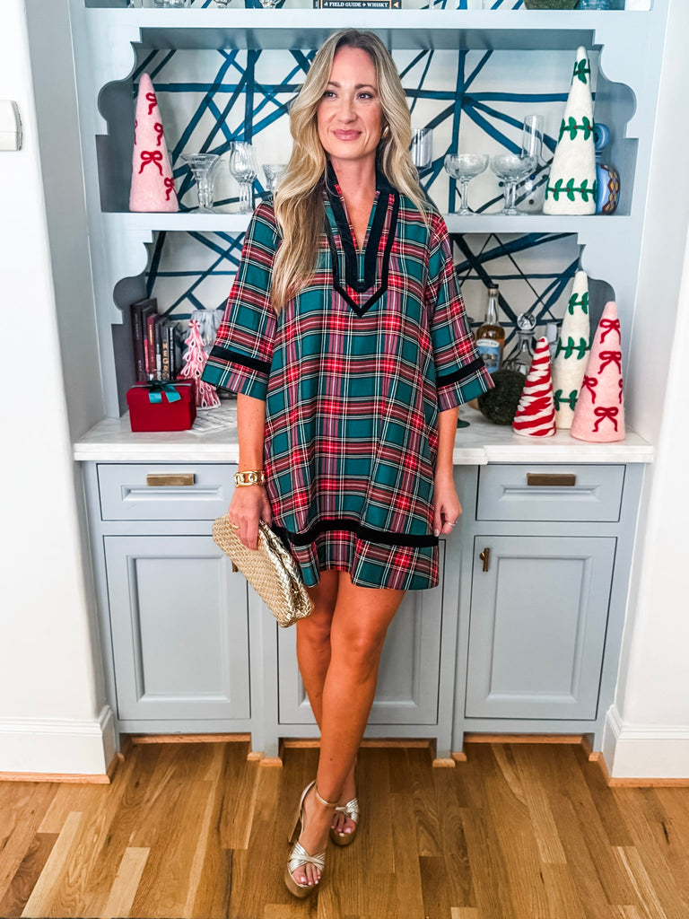 Holiday Cheer Plaid Mini Dress in green brings holiday style with its charming 3/4 sleeves and split neckline finished in contrasting velvet trim. Practical side pockets keep your essentials close, while the fully lined interior ensures comfort and coverage. Made from lightweight woven fabric that's never sheer, it's the perfect go-to piece for seasonal celebrations and gatherings.