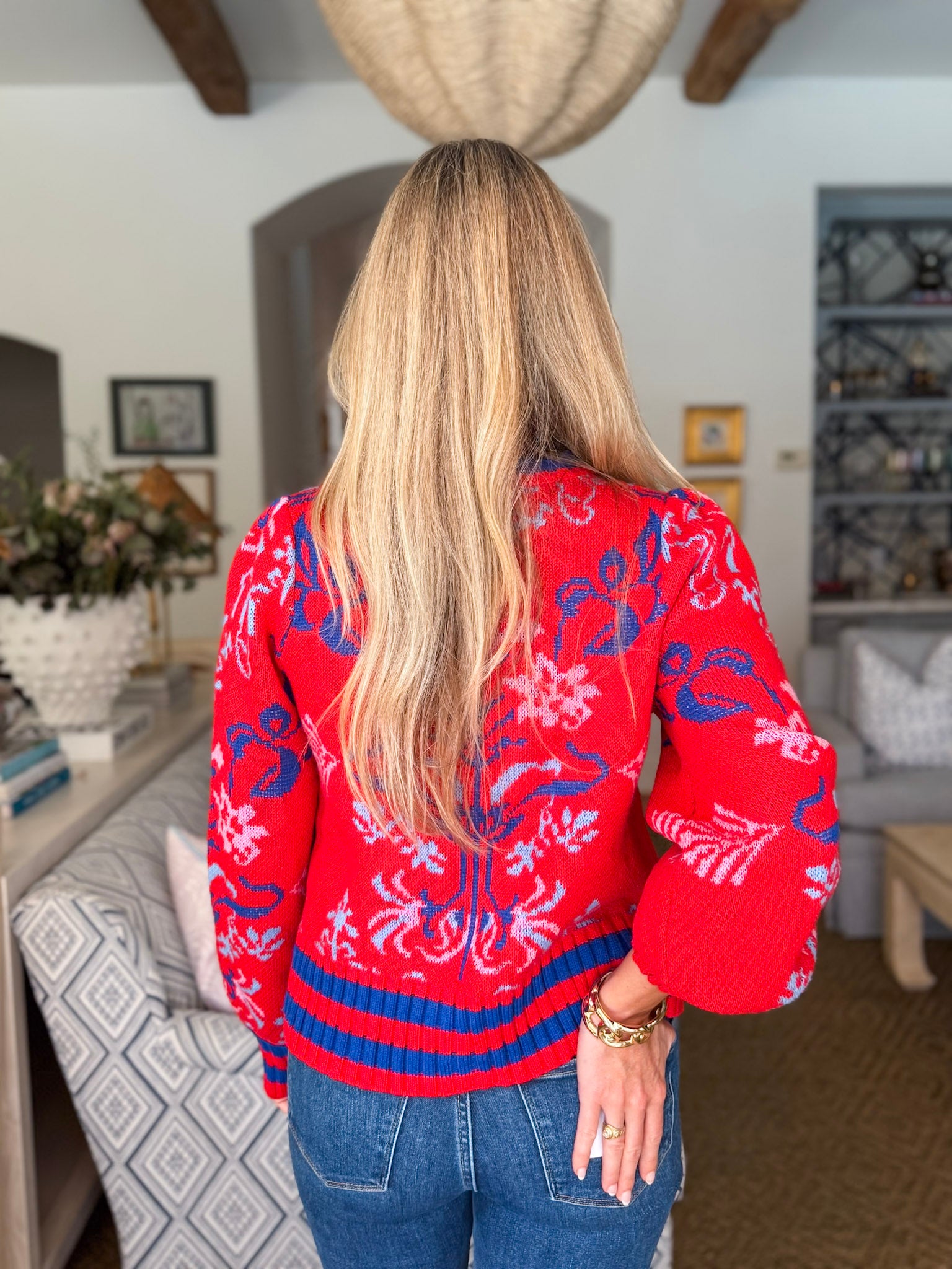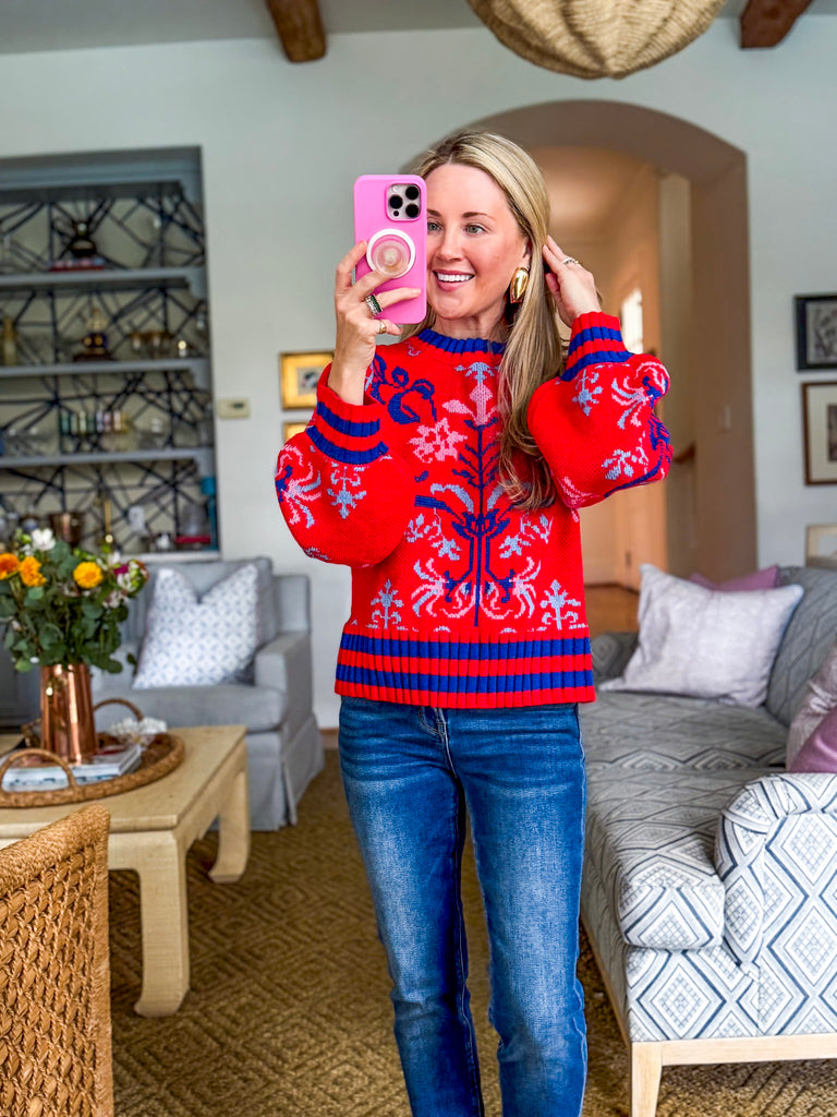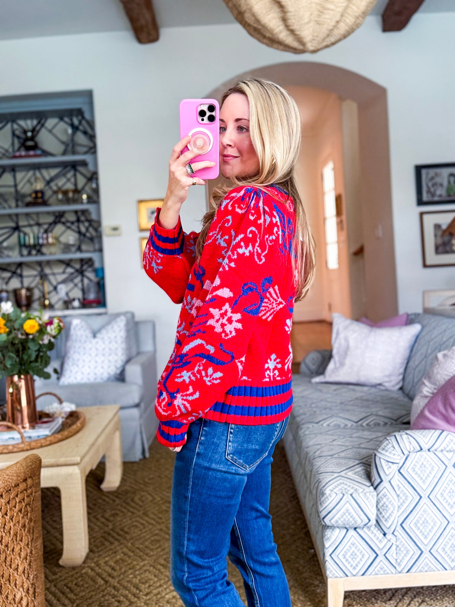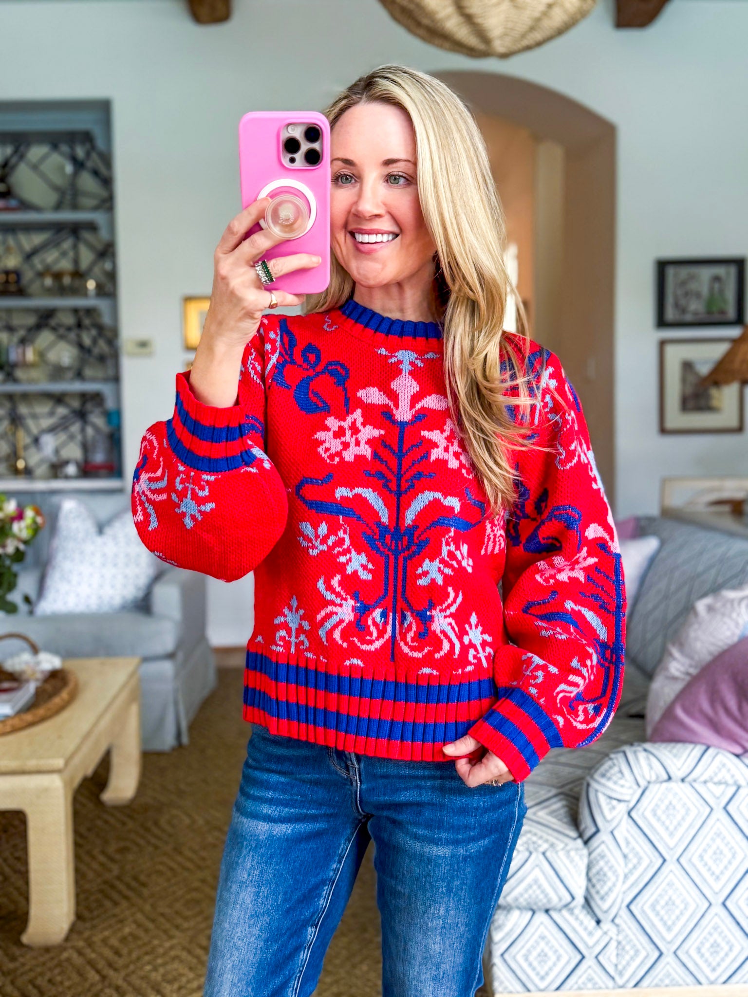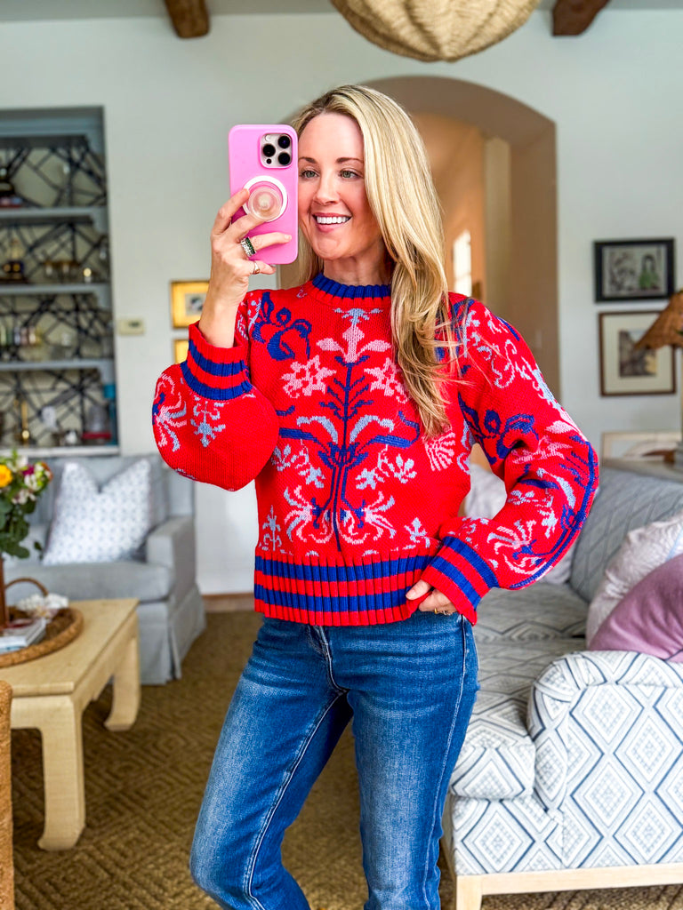 Bring bold energy to your fall and winter style with Almila Patterned Sweater in red multi. This vibrant sweater features an intricate floral inspired pattern in contrasting pink and blue, long sleeves, and a fitted silhouette. Style with a leather mini skirt, ankle boots, and a sleek crossbody bag for a chic, modern vibe.
