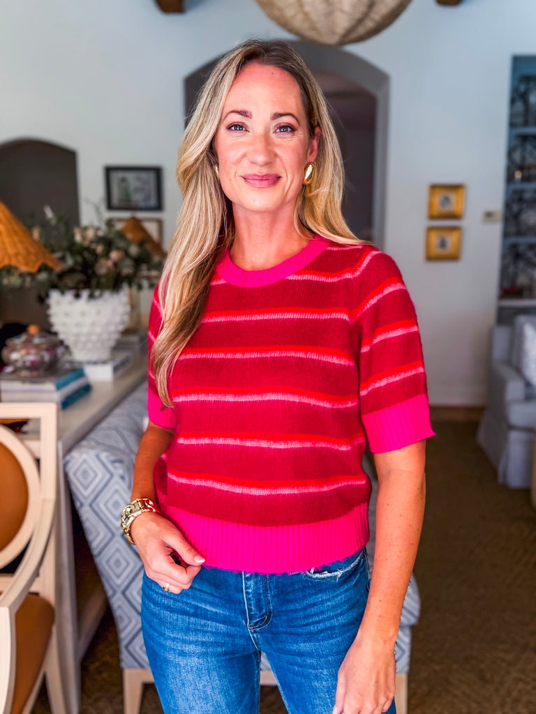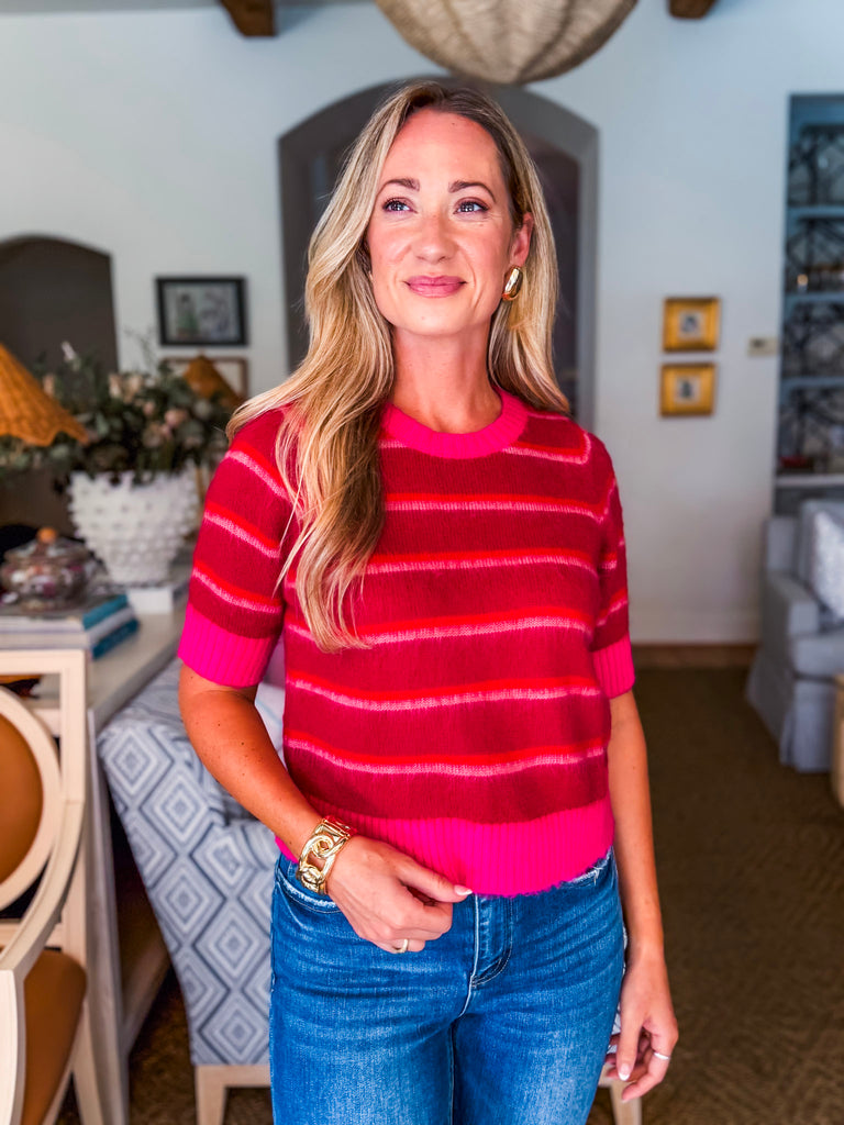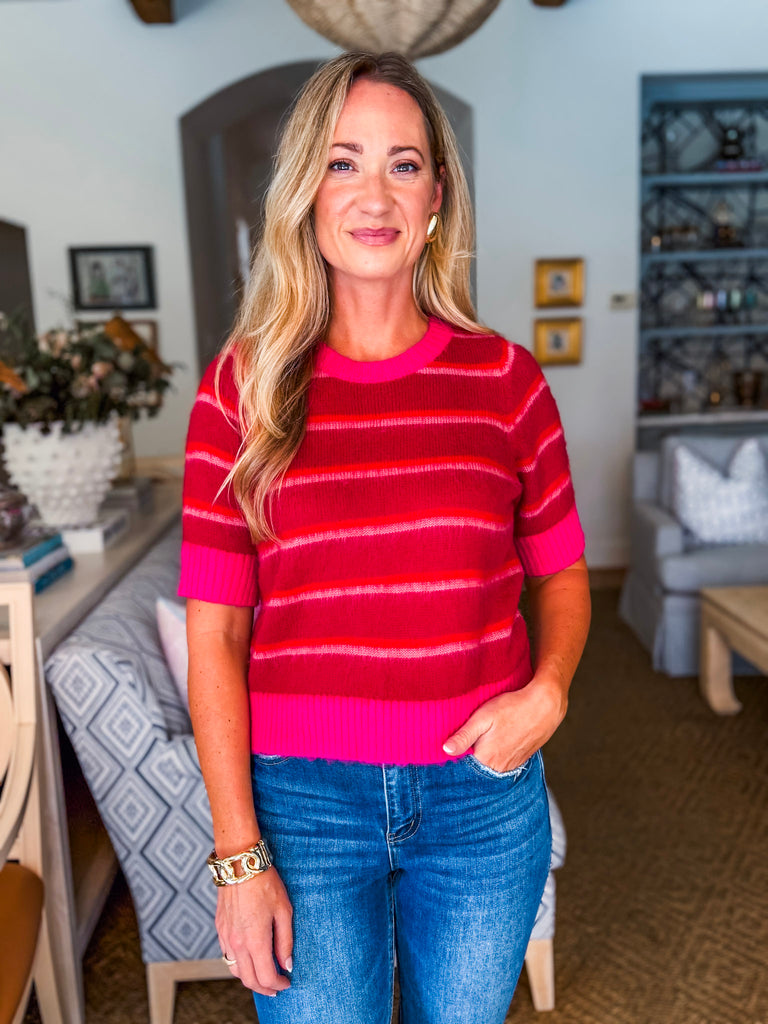 Add a pop of fun to your wardrobe with Avanti Stripe Sweater Top in burgundy! With its vibrant pattern, short sleeves, and flattering cropped fit. The soft texture keeps things comfy while the bold design turns heads. Style it with high-rise jeans, white sneakers, and a mini backpack for a fresh, playful look!