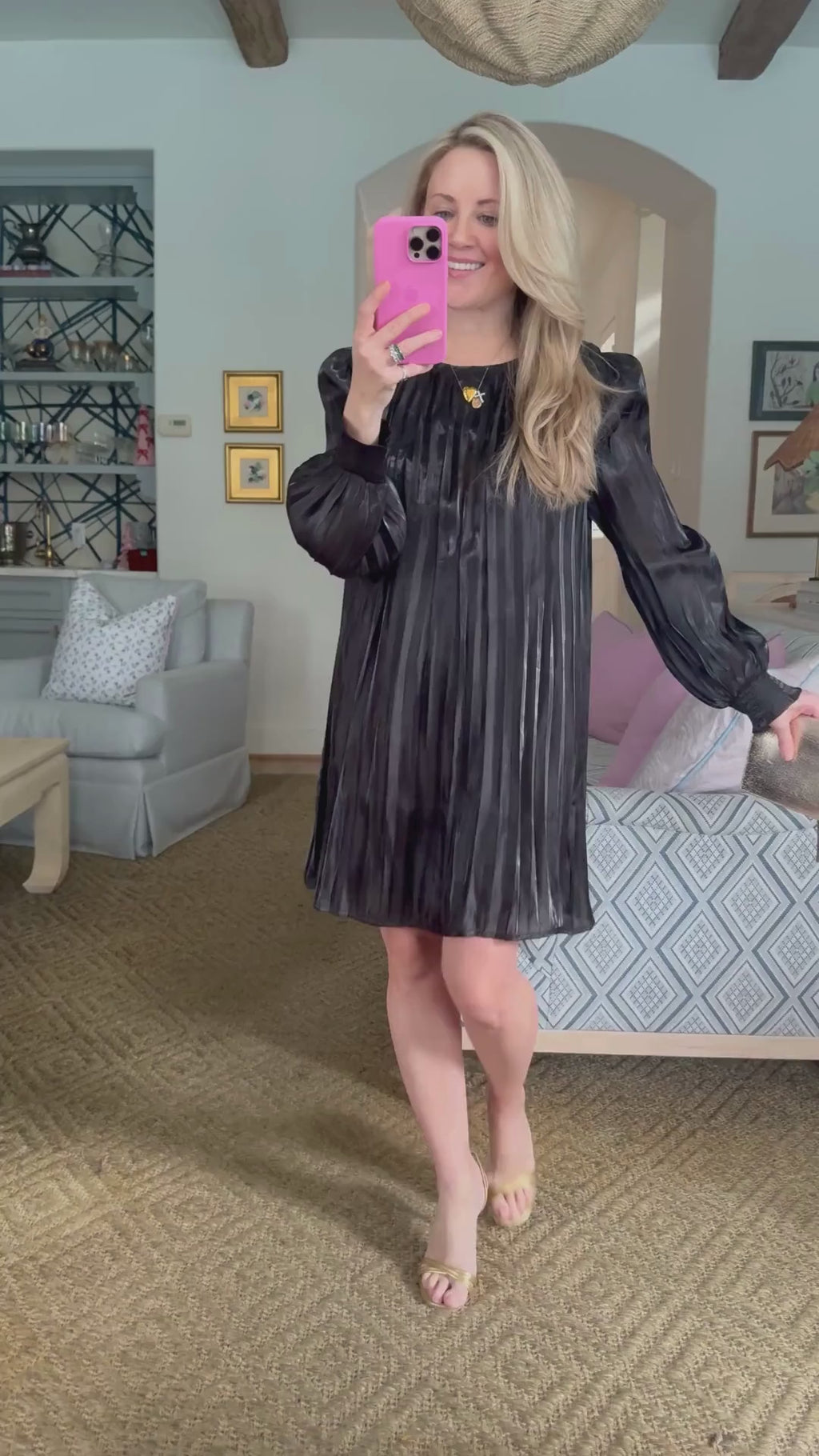 Slip into effortless style with this shimmering Cocktail Hour Ready Mini Dress in black. The metallic fabric catches the light beautifully, while pleated detailing adds dimension and movement. Long sleeves with smocked cuffs provide a polished touch, and the relaxed A-line cut flatters every figure. A classic round neckline pairs perfectly with the charming back keyhole and button closure for an easy on-and-off. Perfect for cocktails, parties, or any occasion calling for a little sparkle.