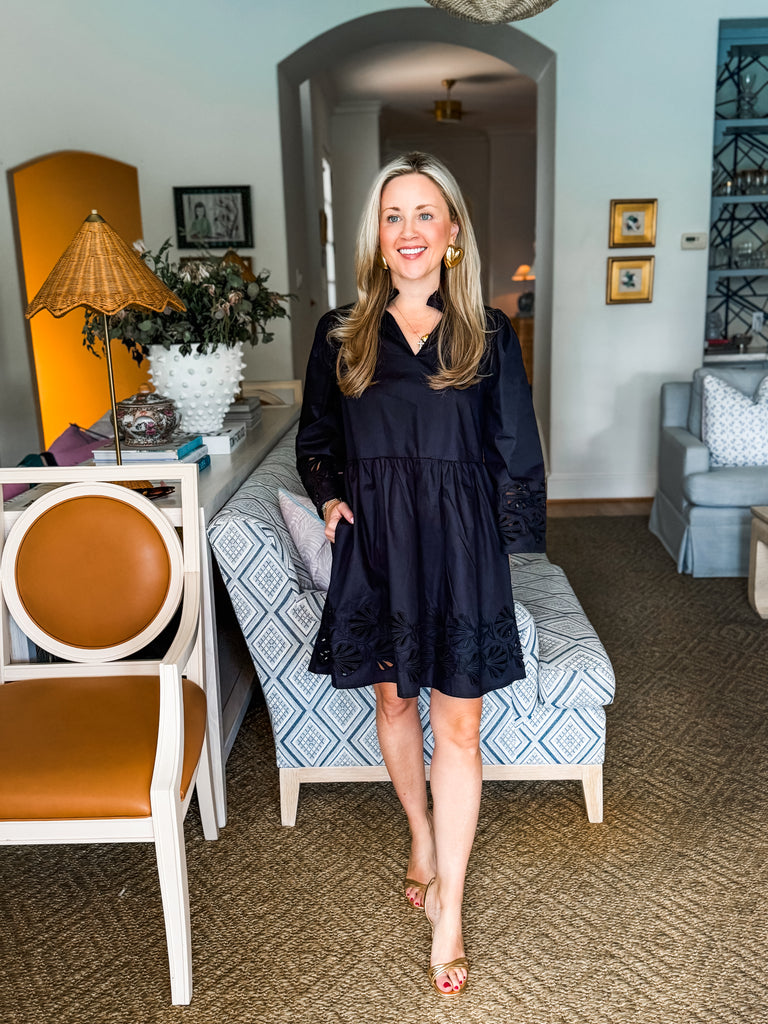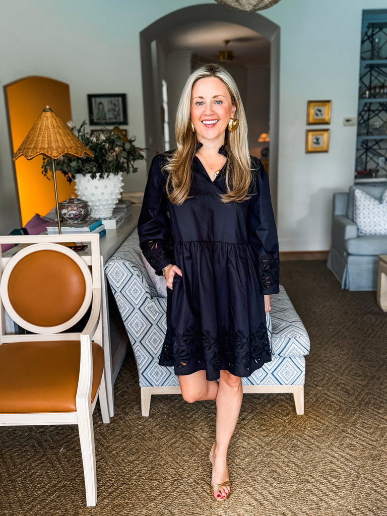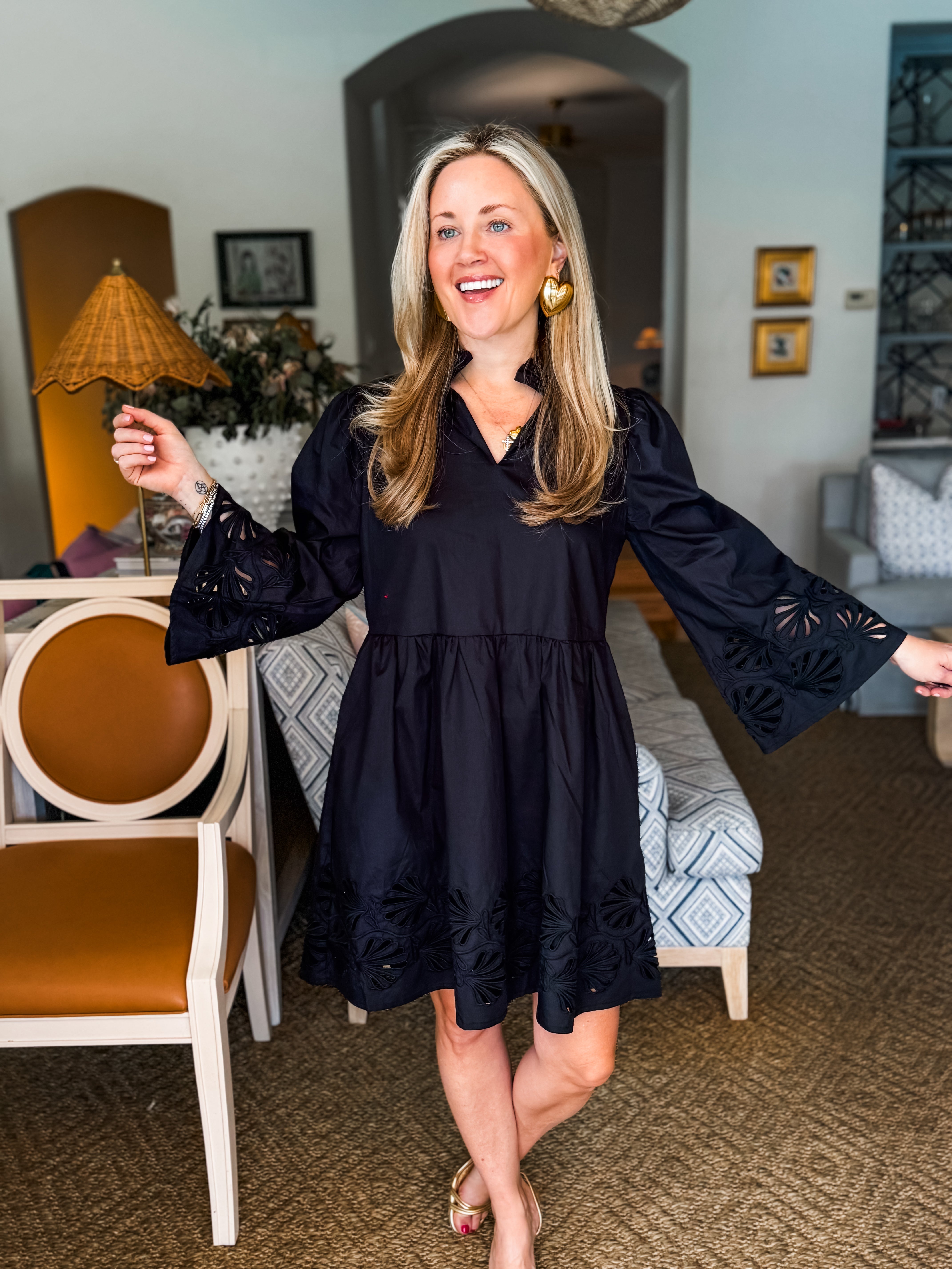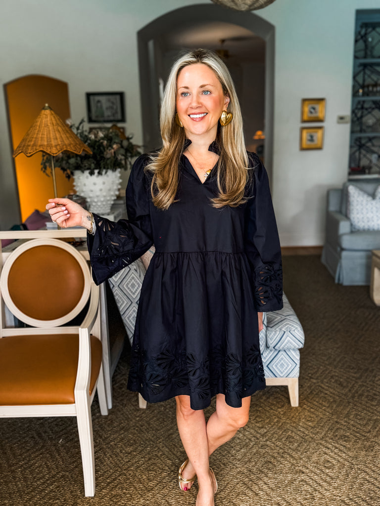 Feel feminine and flirty in the Eyelet Love Mini Dress in black. Its ruffled high neck and 3/4 sleeves are perfect for coffee dates, outdoor picnics, or an evening stroll. Eyelet accents add delicate charm while side pockets keep it practical yet stylish. Slip on your favorite heels or flats and let this dress do the talking.