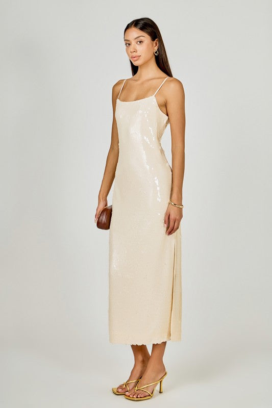 Slip into pure sparkle with Glam Girl Sequin Slip Dress in ivory that's ready to turn heads. Featuring a fitted silhouette, plunging V-back, and a cheeky side slit for movement, this sleeveless stunner comes with adjustable straps for the perfect fit. Whether you're hitting the dance floor or making a grand entrance, this dress delivers all the glam without the fuss.