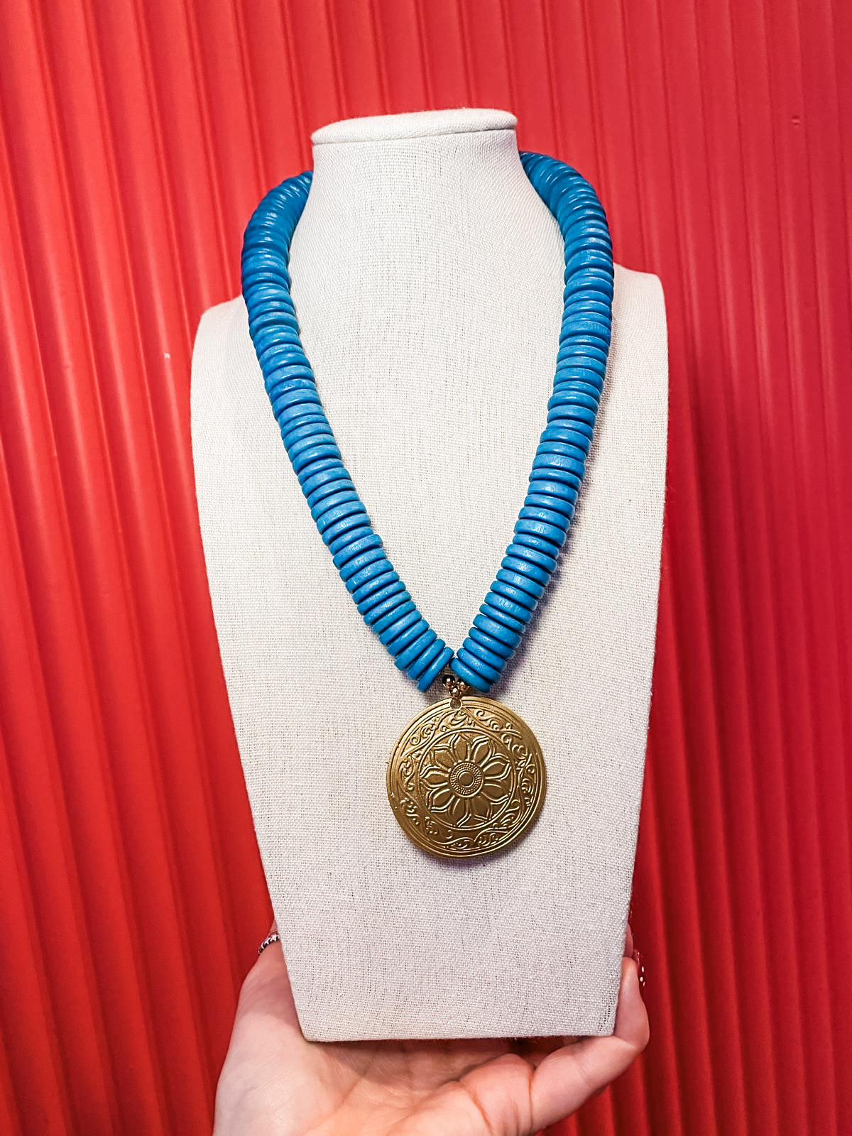 Make a bold impression with this charming Floral Medallion Beaded Necklace in stunning teal. This playful piece combines a lustrous gold circle pendant with graceful rondelle beads, creating the perfect accessory to transform your everyday look into something extraordinary. Whether you're dressing up or keeping it casual, this necklace adds just the right touch of sparkle and sophistication to any outfit.