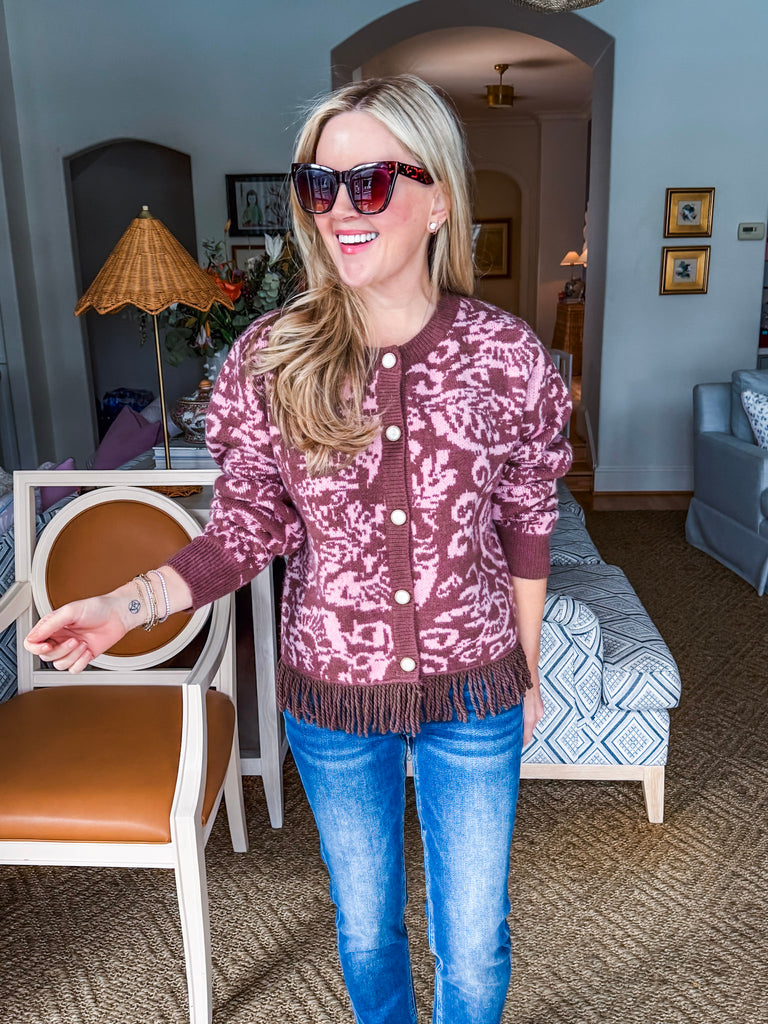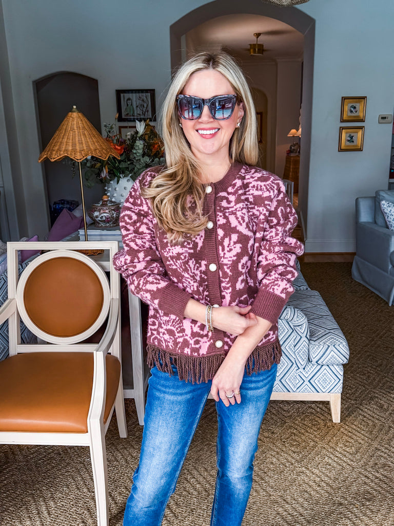 Meet the Elegant Approach Fringed Cardigan in mocha pink – your new go-to for cozy sophistication. With its abstract floral knit and playful fringed hem, it’s the perfect mix of classic and fun. Button it up for brunch or leave it open for a relaxed day out. Pair with jeans or slacks for that effortlessly polished look women love.