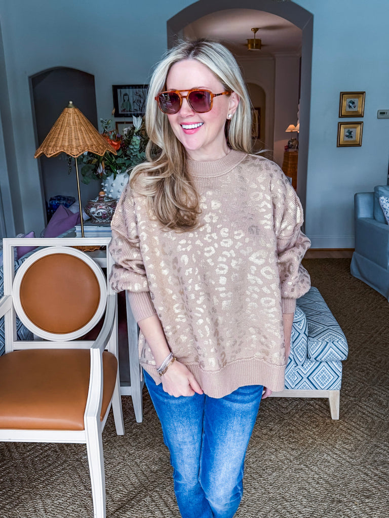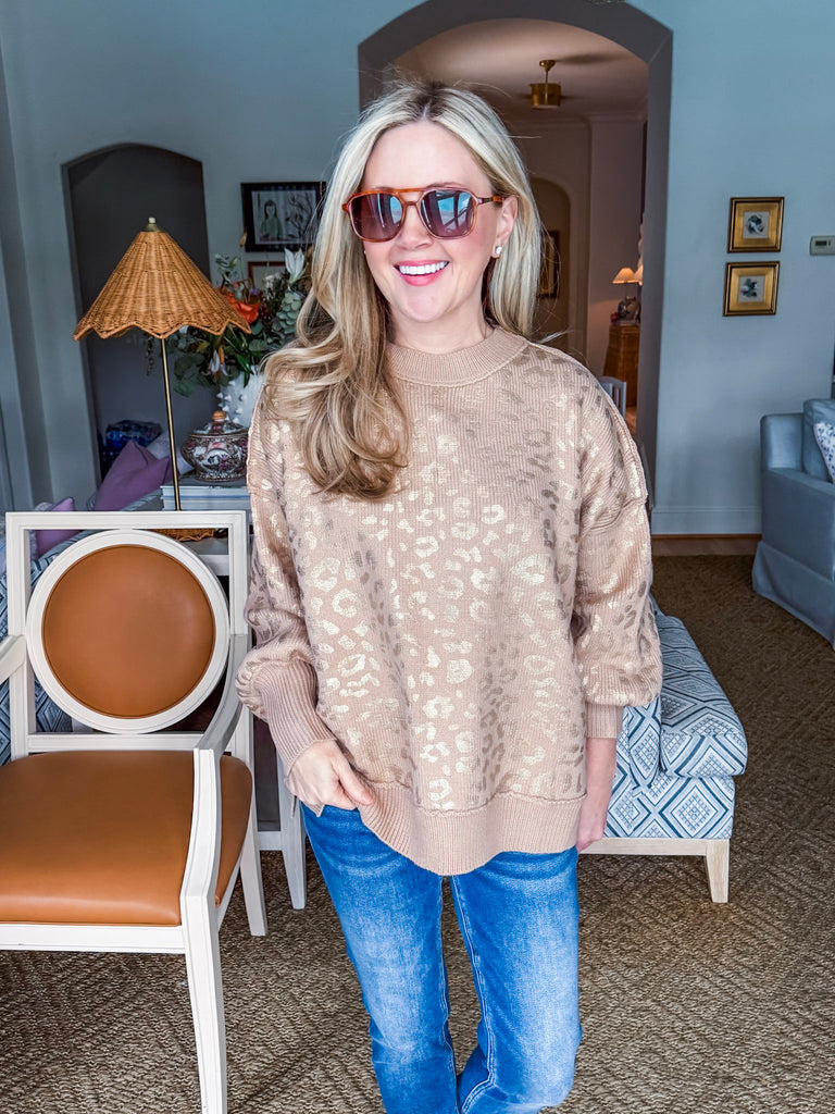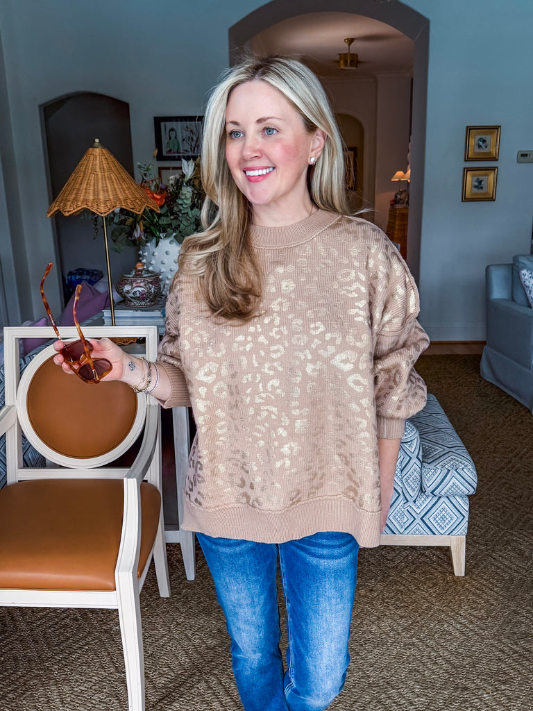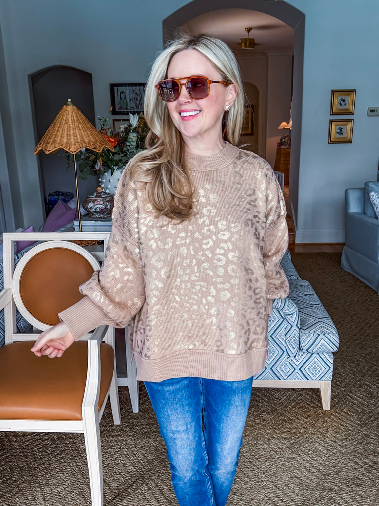 Purrrfect your style with Feline Glow Sweater in taupe and gold featuring a shimmering foil animal print. The classic crew neck design offers timeless comfort while the eye-catching feline graphics add a playful touch to any outfit. Whether you're a cat lover or just looking for something fun and fabulous, this cozy sweater delivers style with a side of meow.