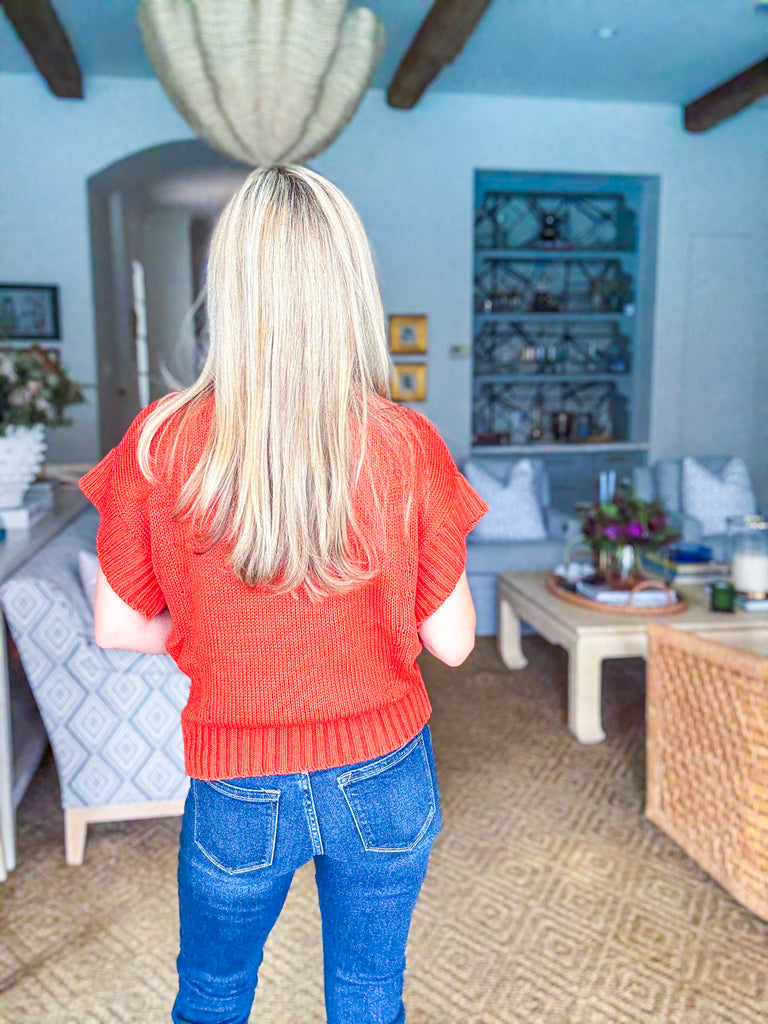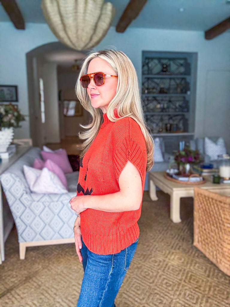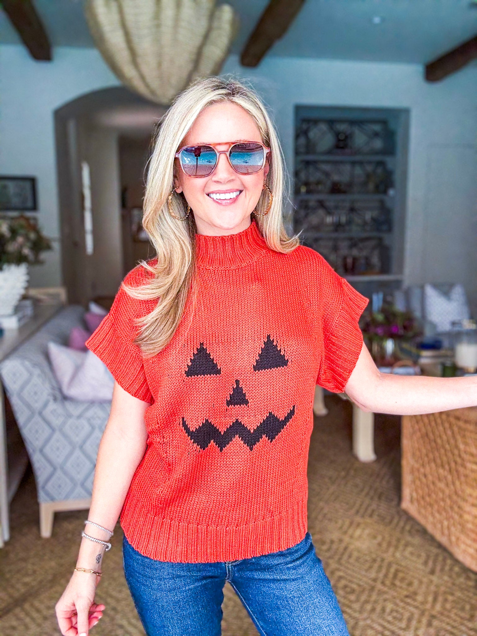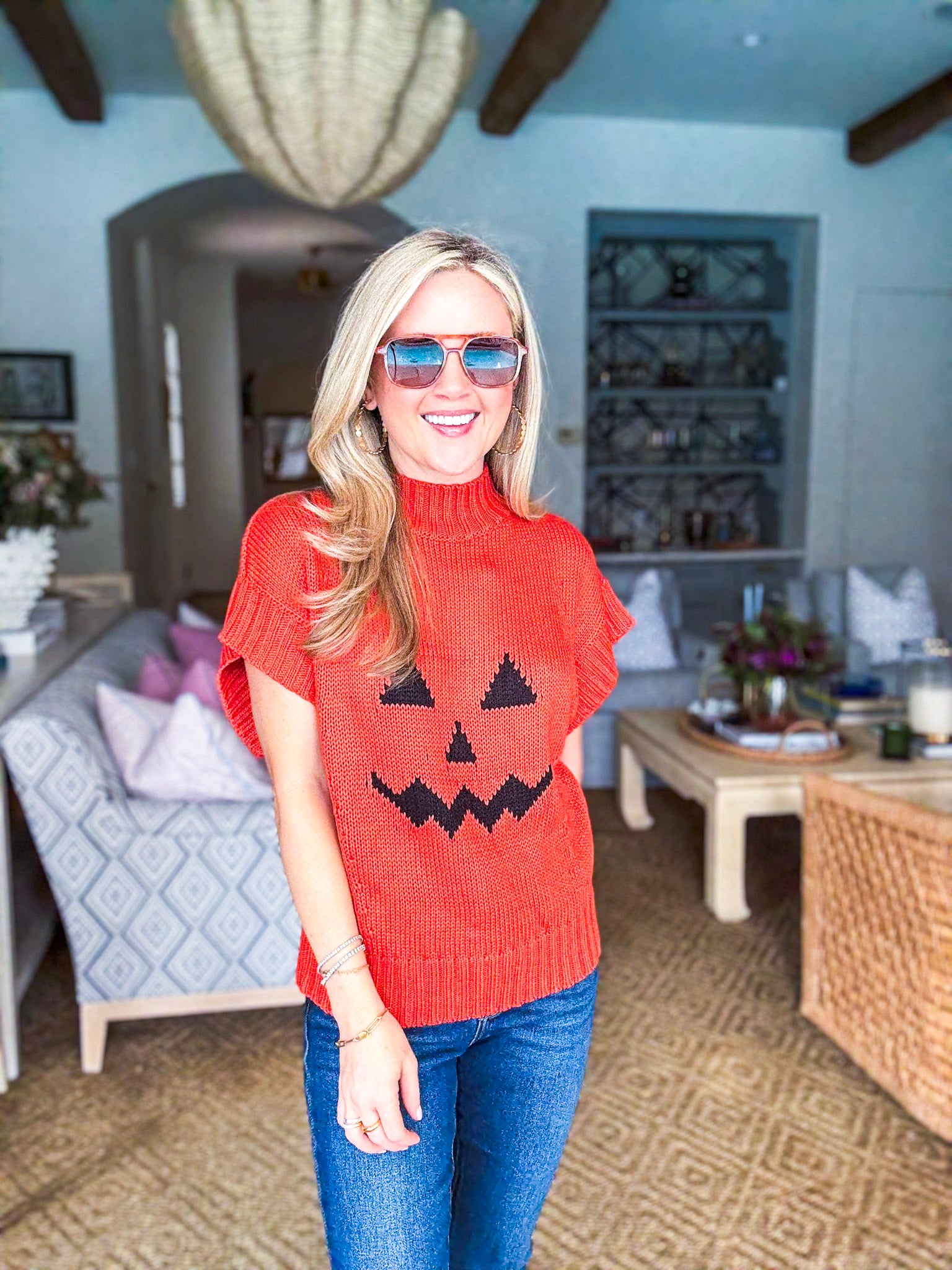 Get into the Halloween spirit with our Halloween Jack O Lantern Sweater in rust! This sleeveless knit vest is a fun and festive way to celebrate the spooky season. Made from a soft cotton acrylic blend, it’s perfect for layering when the air turns crisp. Style it with boots and a long sleeve top for a playful yet cozy fall outfit!
