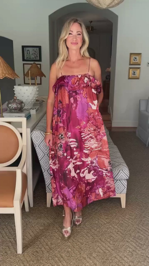 Features: Bold floral print midi dress, ruffled neckline, spaghetti straps, and back button closures.