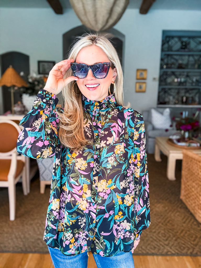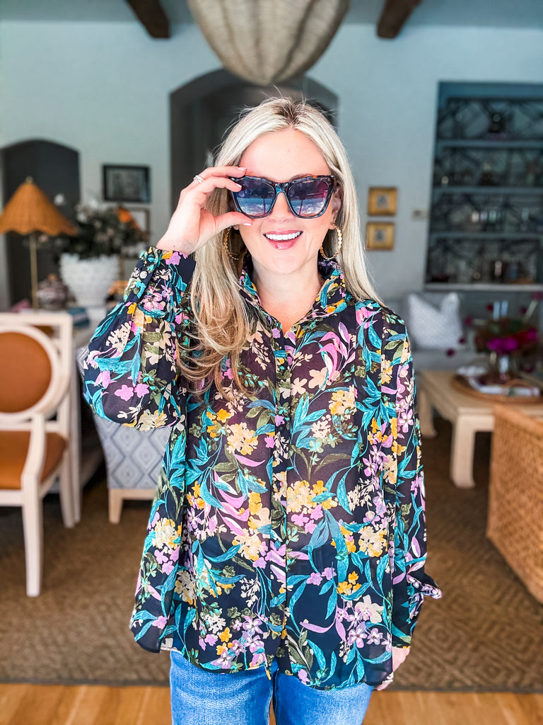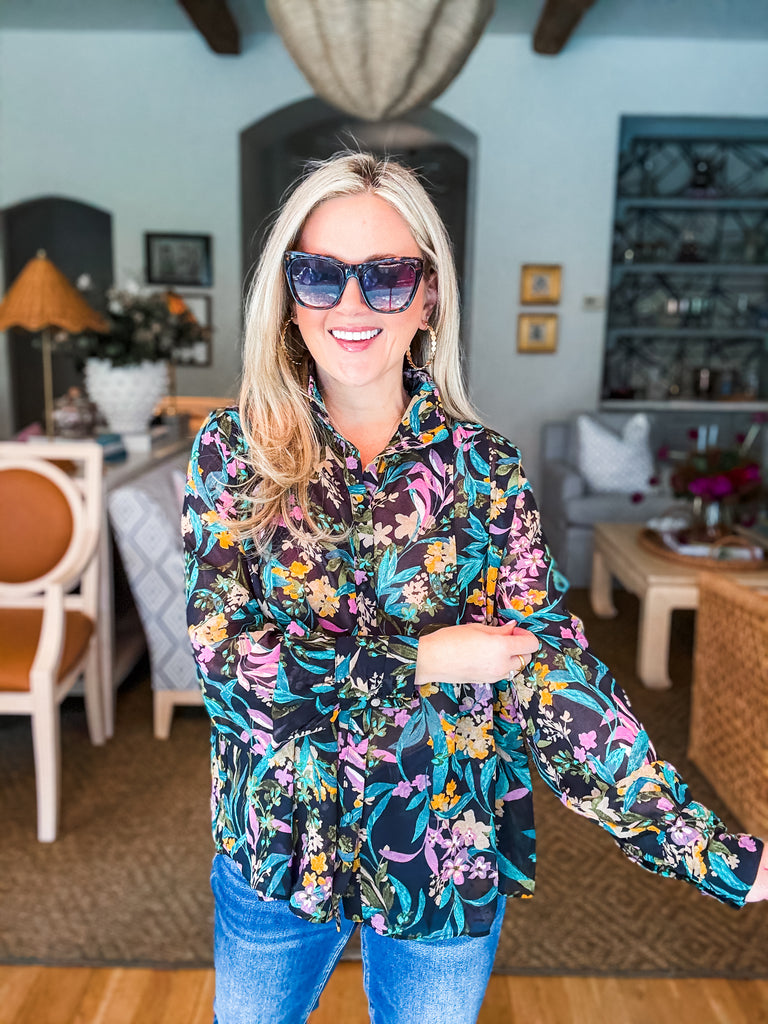 Fall in love with the Midnight Garden Floral Top – a gorgeous mix of classic and modern. The button front and collared detail keep it chic, while the floral print adds a soft romantic feel. It’s perfect for everything from workdays to wine nights. Style it tucked into jeans or flowy skirts for that effortless vibe.
