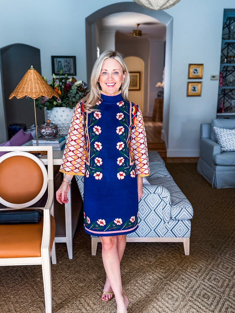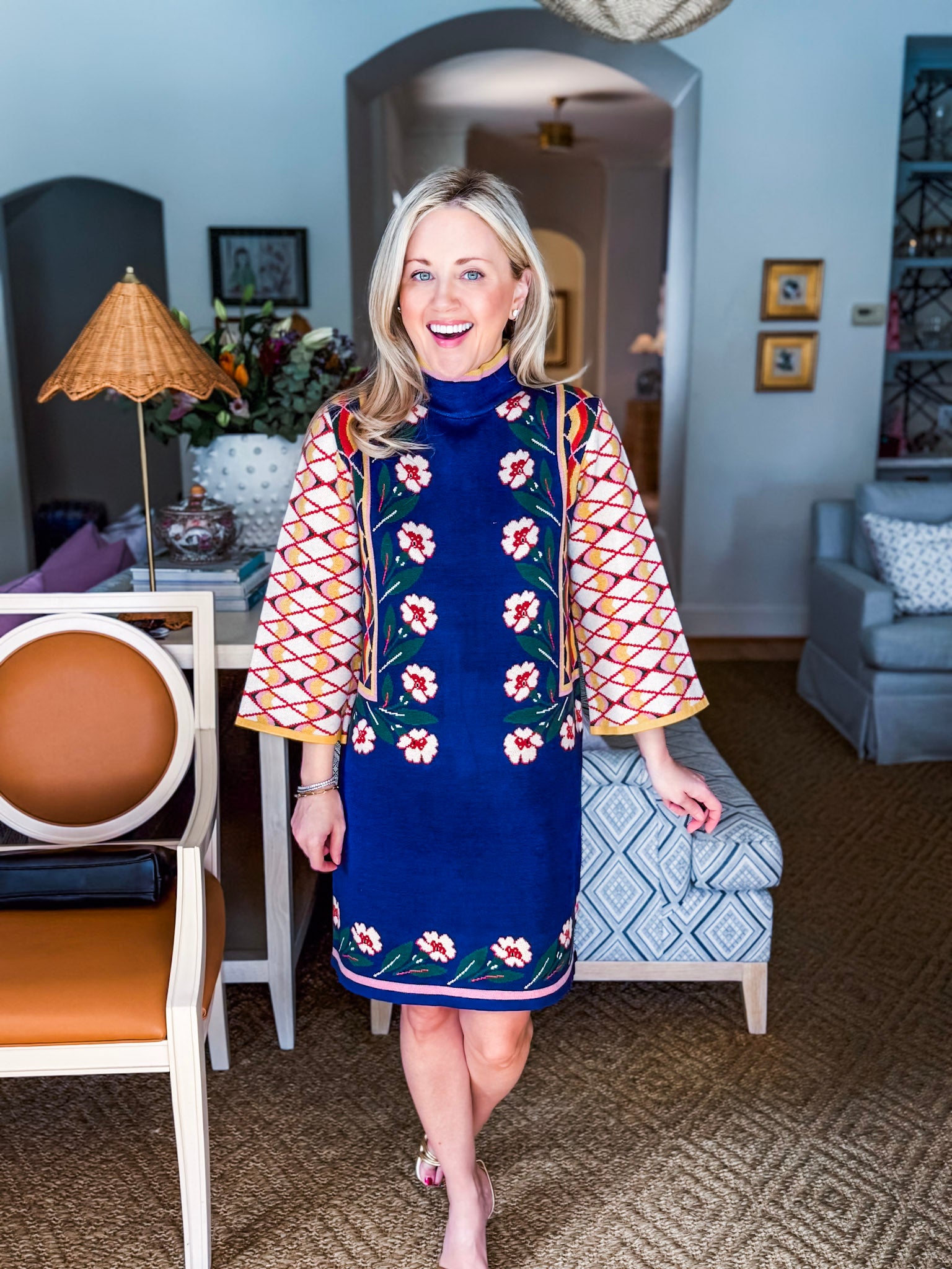 Elevate your everyday style with Modern Groove Jacquard Knit Dress in navy that blends contemporary flair with timeless appeal. Featuring an eye catching mix of floral and geometric patterns, this high-neck sweater dress delivers both warmth and sophistication. Perfect for layering or wearing solo, it's your go-to piece for looking polished without trying too hard. Cozy comfort meets modern edge in one fabulous package.