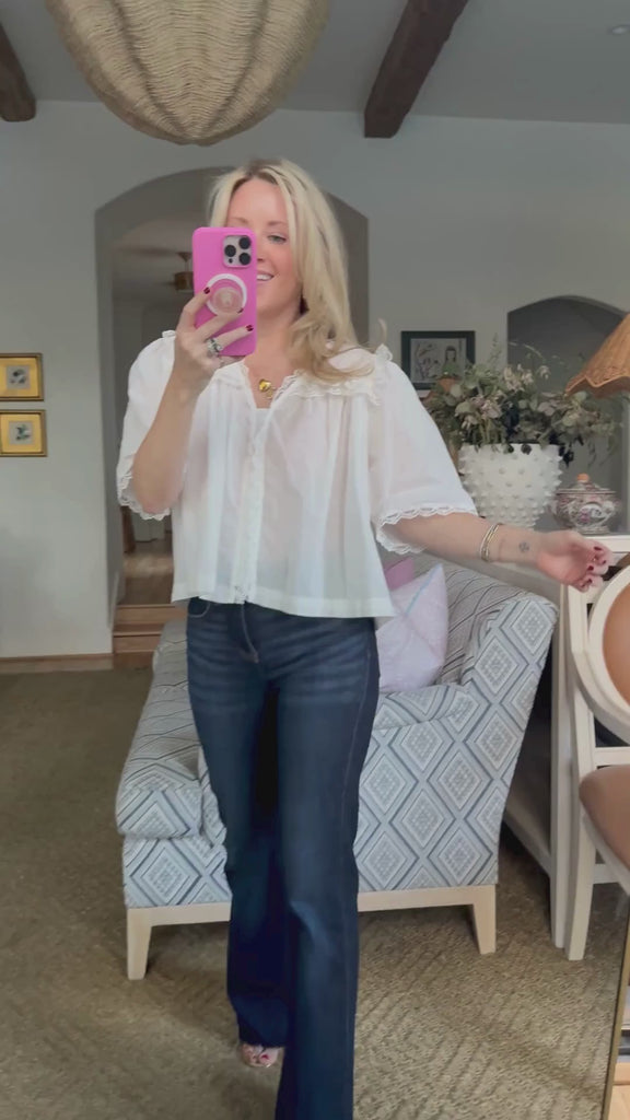 Pure Thread Lace Top in ivory features delicate lace accents throughout, including a refined collar and intricate lace trim. The shirred bodice creates a flattering silhouette, while the front button-down closure offers easy styling. Designed without elastic or smocking for a natural drape, this unlined piece keeps things light and breezy. Perfect for layering or wearing solo, it's a versatile addition to any wardrobe.