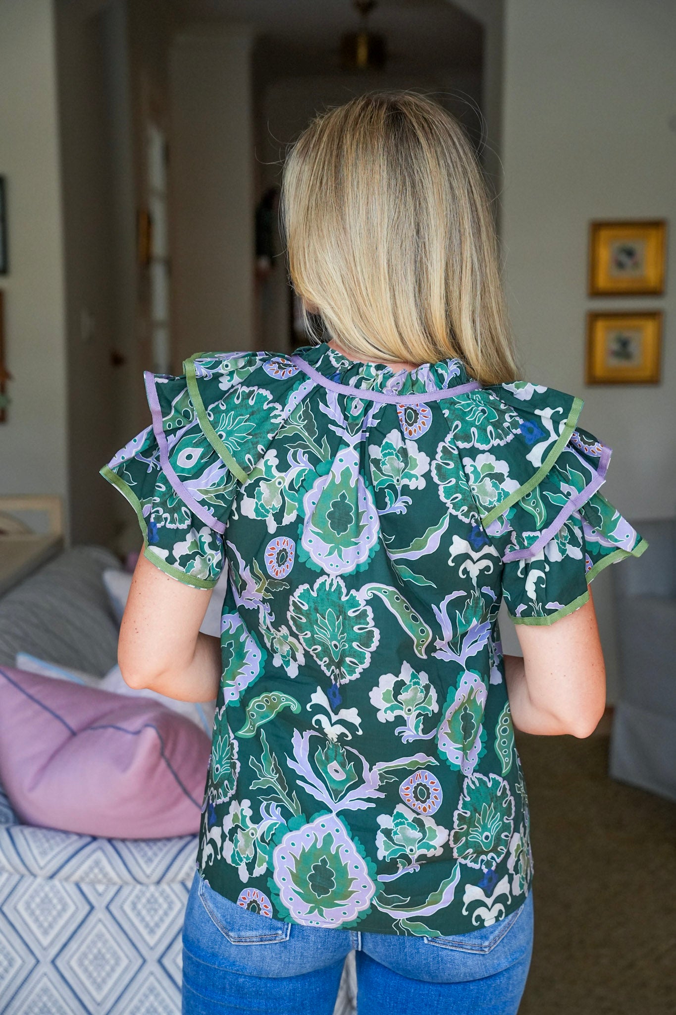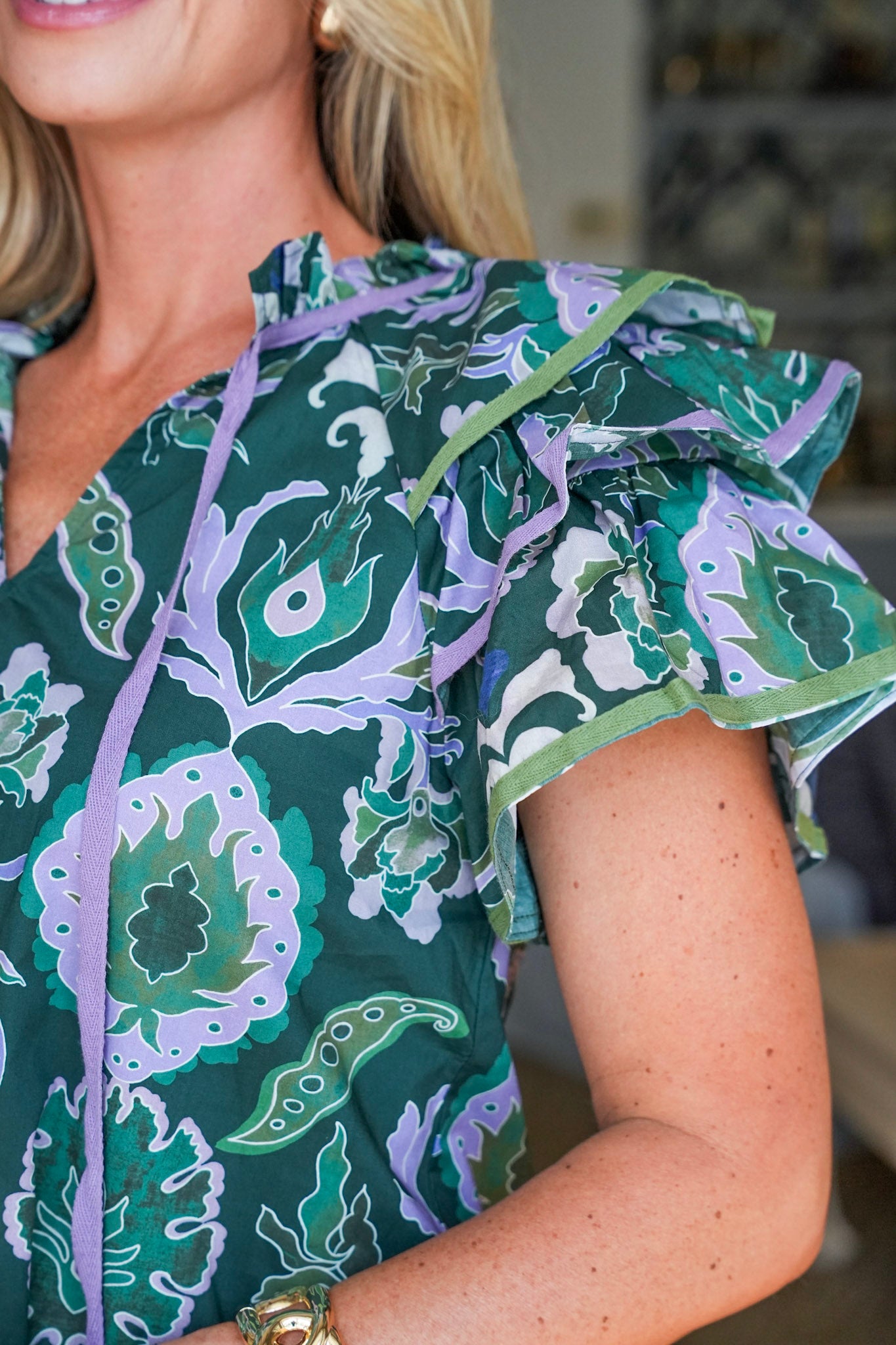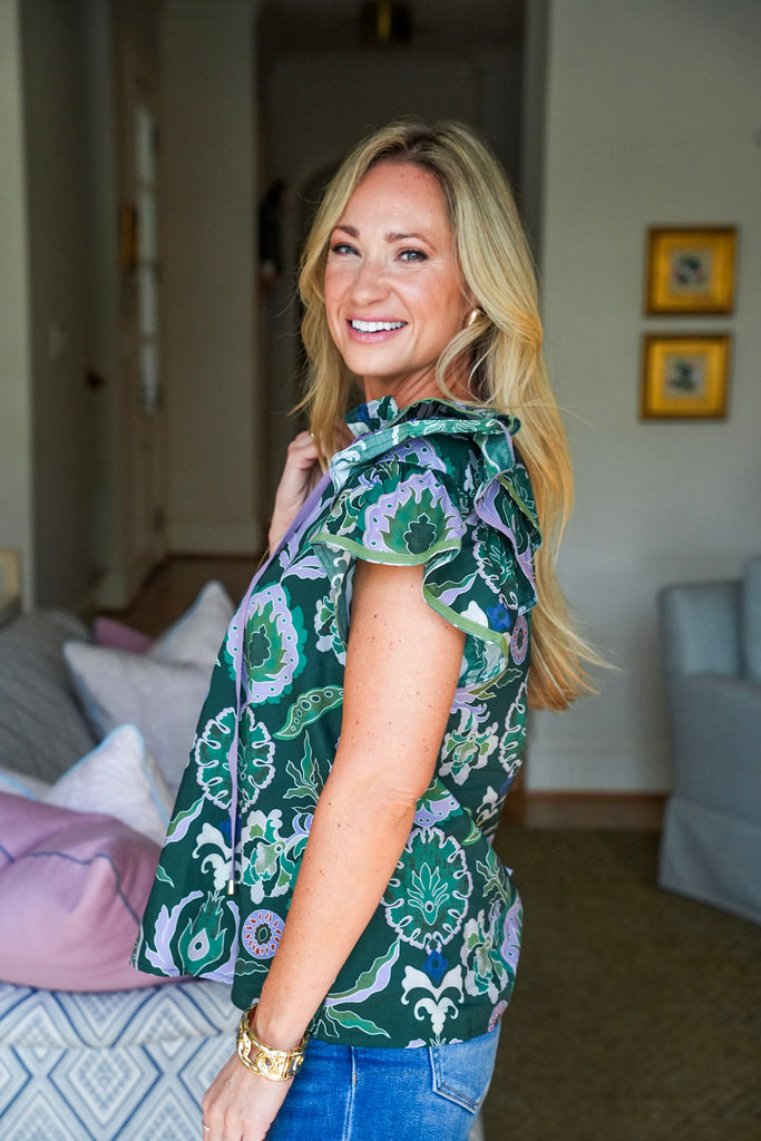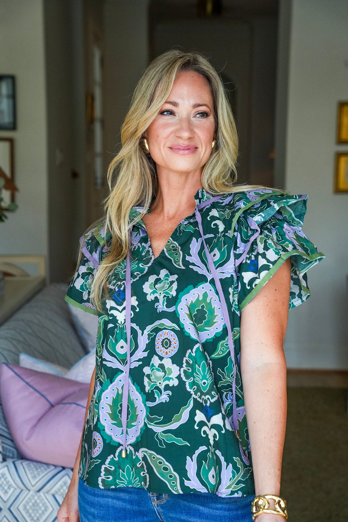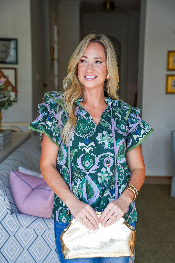 The Sunset In Sorrento Top in green is giving all the vibes with its playful multi-print design and tiered ruffle sleeves. The colorful trim detail adds just the right pop of fun, making it perfect for brunch with friends or sightseeing on a weekend getaway. Lightweight and breezy, it’s an easy piece to throw on and feel instantly put-together. Pair it with jeans, shorts, or a chic skirt—this one’s a mood booster.
